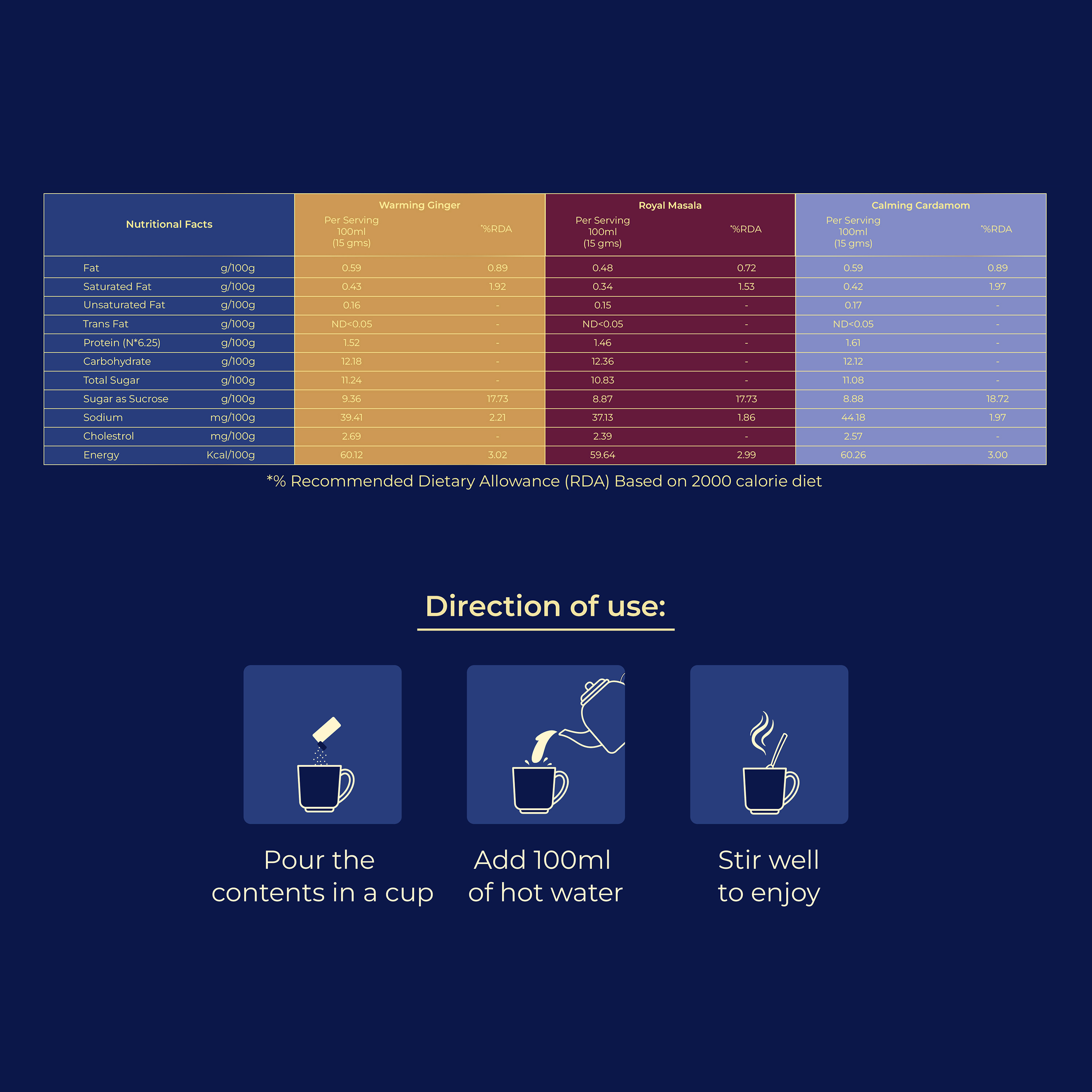 Milk Solids (52.5%), Sugar (40%), Tea Extract from Fresh Green Tea Leaves (7%), Natural Cardamom Extract (0.5%)